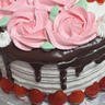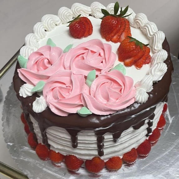 Tres-leches white cake filled with chopped pecans and strawberries, covered and decorated in a vanilla Chantilly cream, topped with regular and chocolate-covered strawberries and pecans.